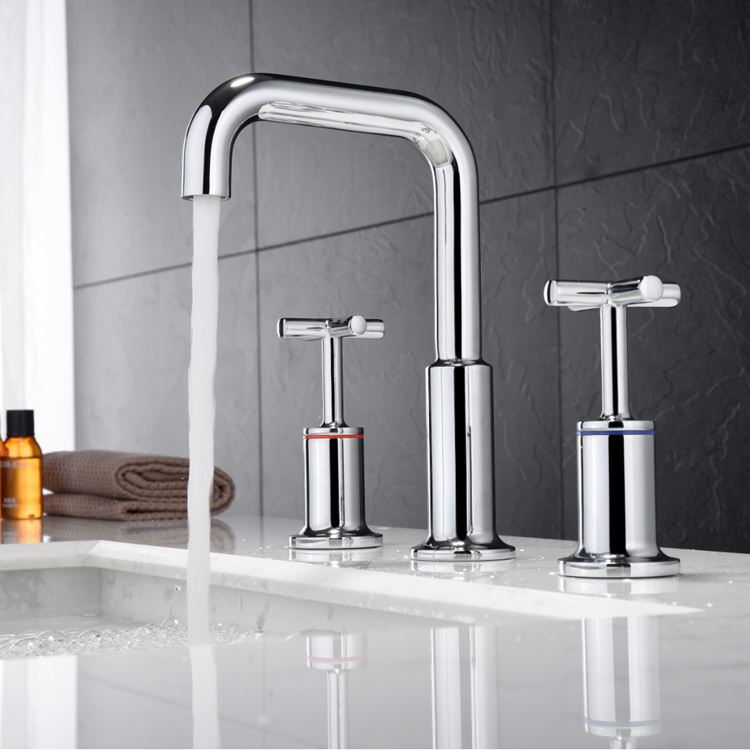 Hot Selling Modern Design Chrome Finish Brass Basin Faucet 3-Hole Dual Handle Deck Mounted Ceramic Widespread for Bathrooms