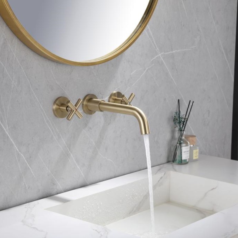Luxury Wall Mounted Basin Mixer Faucet Brushed Gold Brass Vanity Faucet 3 Holes Taps for Bathroom