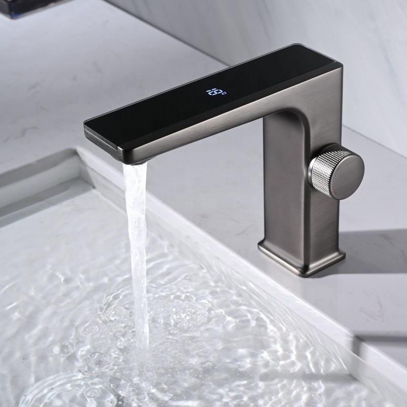 Temperature Digital Display Bathroom Mixer Water Taps Gun Grey Brass Deck Mounted Electric Basin Faucet with Rotating Handle